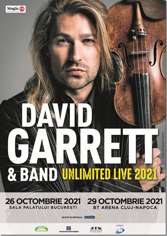 Biletele pentru concertele marelui violonist David Garrett, ce vor avea loc pe 26 și 29 octombrie 2021, la Sala Palatului din București și la BT Arena din Cluj-Napoca, sunt disponibile în rețeaua Eventim.ro.
