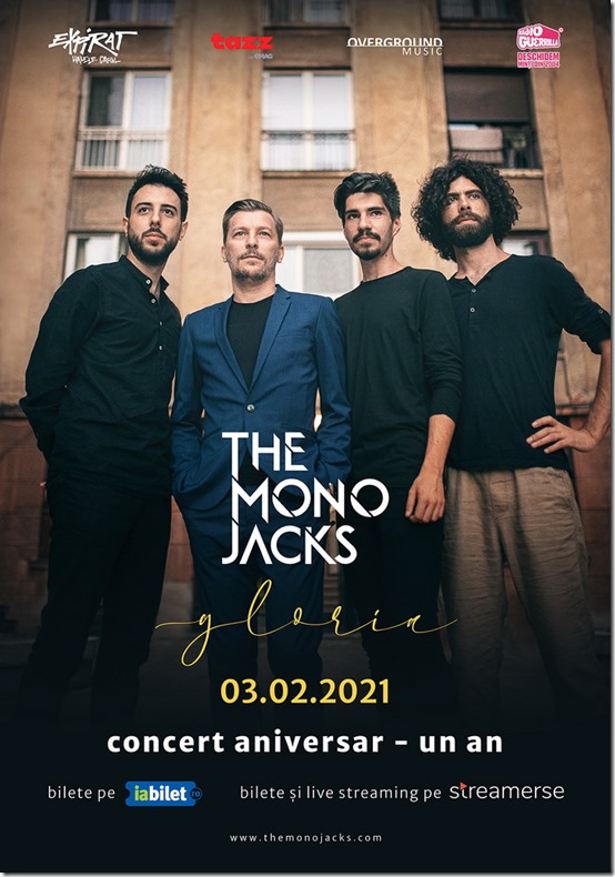 Concertul de pe 3 februarie va sărbători un an de la lansarea ”Gloria” și va cuprinde un playlist special, aniversar. Evenimentul se va transmite în direct începând cu ora 21.00, pe platforma Streamerse – https://streamerse.net/event/the-mono-jacks-live-concert-aniversar-gloria și va putea fi vizionat din toate colțurile lumii. Biletele pentru eveniment sunt disponibile pe Streamerse și în rețeaua iabilet.ro, iar cei care doresc să susțină trupa pot alege între trei categorii de bilete – la 35, 50 și 75 de lei – în sistem „pay what you want”.
