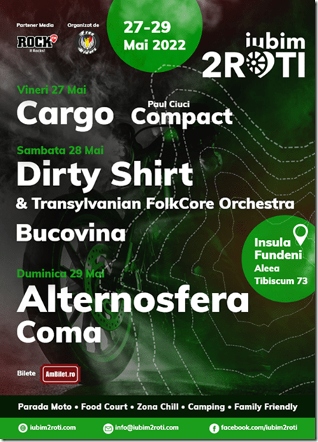 În perioada 27-29 mai 2022 pe insula Fundeni din București te așteaptă o atmosferă family-friendly, creată din dragoste pentru muzică și două roți: parada moto, zone de food&drinks și relaxare, camping, toate cu misiunea de a goni rutina și a reinventa weekendul bucureștean.