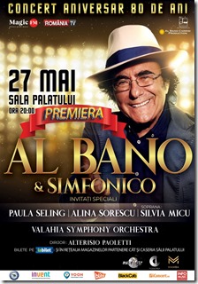 Biletele pentru concertul aniversar AL BANO & SIMFONICO pot fi achiziționate la prețuri variabile în funcție de categoria de loc, de la Casa de Bilete a Sălii Palatului și online de pe Iabilet.ro