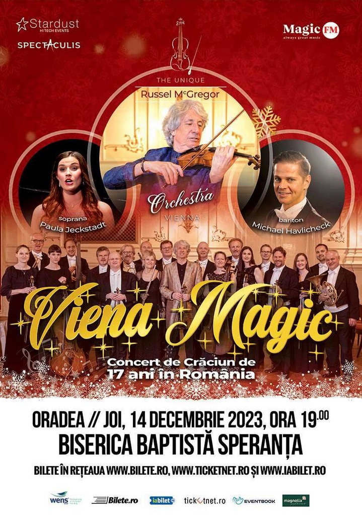 Sărbătoarea muzicii clasice „VIENA MAGIC”, înnobilată cu interpretările remarcabile ale celor mai iubite valsuri vieneze, va răsuna pe 11 decembrie la Sala Patria din Brașov, pe 12 decembrie, la Cinema Florin Piersic din Cluj-Napoca, pe 13 decembrie la Teatrul Clasic Ioana Slavici din Arad, iar pe 14 decembrie la Biserica Baptistă Speranța din Oradea.