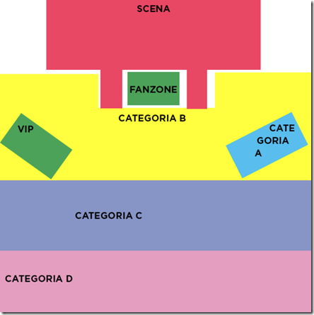 – Categoria B – în picioare, în fața scenei. Posesorii de biletele la categoria B nu au acces la categoria A, dar au acces la categoriile C și D.