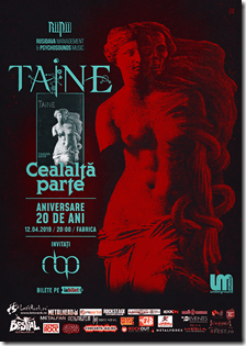 Postat: 10/04/2019 Înscris în: Știri | Tags: 12 aprilie, 20 ani, 2019, aniversare, bucuresti, cealalta parte, concert, fabrica, taine Scrie un comentariu„Rusidava Management & Psychosounds Music” vă prezintă vineri 12 aprilie 2019 un eveniment de gală al formației Taine: aniversarea a 20 de ani a celui mai bun album death metal romanesc – „Cealaltă Parte”. În deschidere: Mihai Barbu Project.