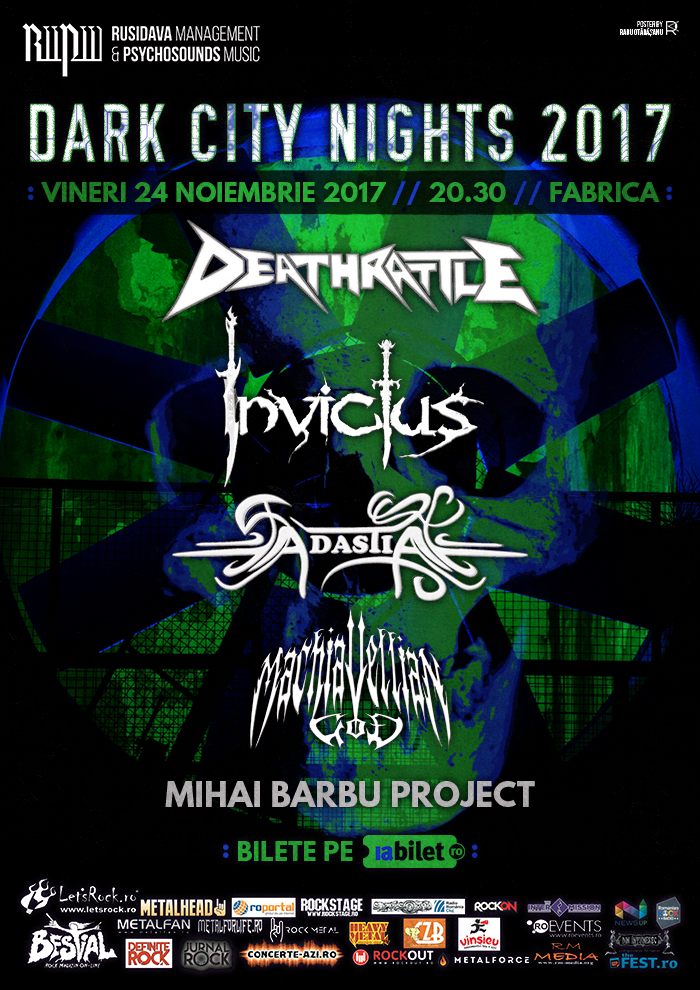 Postat: 22/11/2017 | Autor: Adrian C | Înscris în: Știri | Tags: 2017, 24 noiembrie, adastia, concert, dark city nights, deathrattle, fabrica, invictus, machiavellian god, mihai barbu project |