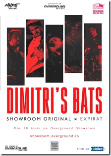 Periodic, vineri de la ora 20:00, pe Overground Showroom – „Netflixul de concerte” – va avea premiera în exclusivitate câte un concert din seria Showroom Original ⨯ Expirat. Pentru că tuturor ne este dor de concerte, de experiența muzicii live, de schimbul de energie dintre scenă și public. Așa că am readus pe scenă cele mai tari trupe de alternativ pentru o serie de concerte filmate, produse de Overground Music și găzduite de Expirat! Seria continuă vineri, 18 iunie, la ora 20:00 cu concertul Dimitri’s Bats. Biletele la premiera online se găsesc online pe www.iabilet.ro la prețul de 29 de lei.