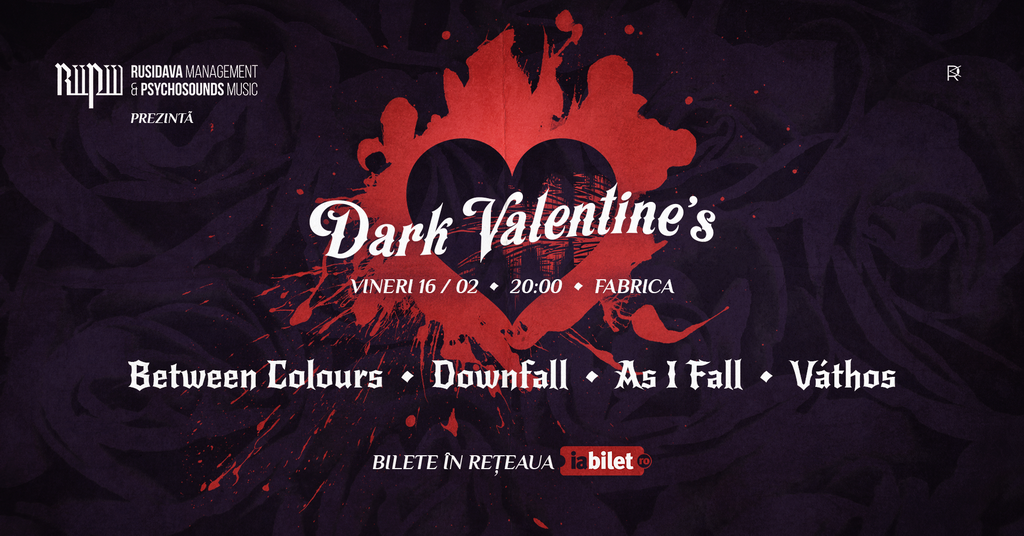 Postat: 17/01/2018 Înscris în: Știri | Tags: as i fall, between colors, concert, dark city nights 2018, dark valentine, downfall, fabrica, Live, psychosounds music, rusidava management, vathos Scrie un comentariu„Dark City Nights” revine în 2018 cu o ediție specială: „Dark Valentine’s”. O seara ce va aduce pe scena din „Fabrica” o serie de trupe din underground-ul romanesc.