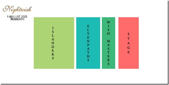– Wish Masters (A) – in picioare, in fata scenei; posesorii de biletele la Wish Masters (A) au voie si in categoriile Elvenpaths (B) si Islanders (C).