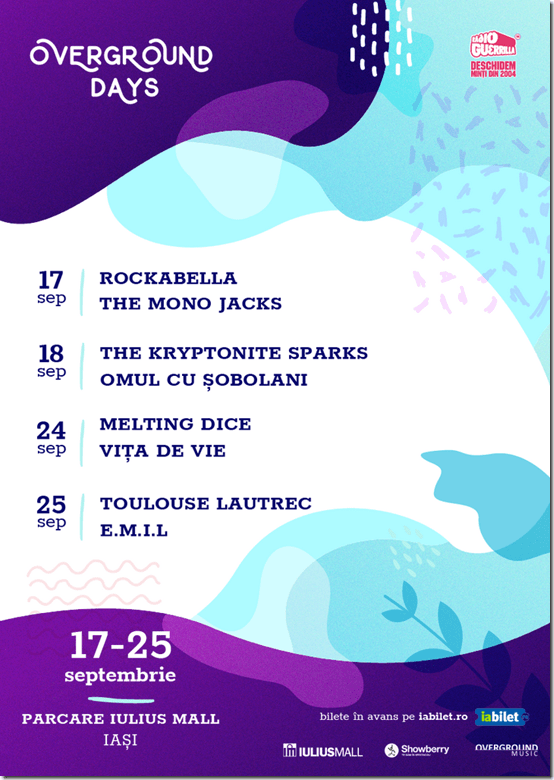 Overground Music si Showberry anunță o nouă mini-serie de concerte: OVERGROUND DAYS la Iași! Evenimentele vor avea loc pe 17-18 și 24-25 septembrie în parcarea Iulius Mall (bd. Tudor Vladimirescu nr. 113), într-un format reconsiderat și adaptat situației și locului, renunțând la tiparele unui concert clasic, pentru un public restrâns și respectând toate normele de distanțare în vigoare.