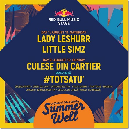 Tsar B (Belgia) și al său electro-pop magic se alătură săptămâna viitoare artiștilor de pe scena Red Bull Music la Summer Well. Little Simz (UK), inițial confirmată pentru sâmbătă, 11 august, nu mai poate ajunge în România din motive neprevăzute de ordin personal. Lady Leshurr și Tsar B vor intra pe scena Red Bull Music sâmbătă, pe 11 august, iar Subcarpați, Cred Că Sunt Extraterestru, Frații Grime, Fantome, Basska, Argatu’ și Moș Martin, Celula de Criză și Hanu’ cu Bragă vor face show cu #TotSatu’ duminică, pe 12 august.