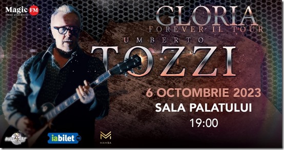 Postat: 07/07/2023 Înscris în: Știri | Tags: 2023, 6 octombrie, bucuresti, concert, sala palatului, umberto tozzi Scrie un comentariuAnul 2023 îl readuce pe celebrul artist italian Umberto Tozzi pe marile scene din întreaga lume în cadrul unui nou turneu grandios, intitulat „Gloria Forever Il Tour”. Fiind considerat unul dintre cei mai mari compozitori ai scenei muzicale italiene, un adevărat showman cu abilități vocale incredibile, Umberto Tozzi este extrem de apreciat pentru atmosfera specială pe care o generează în timpul concertelor sale.